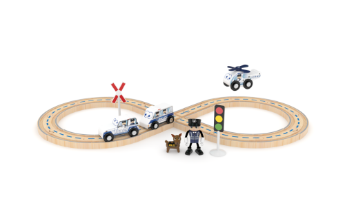 J`adore je řada vzdělávacích hraček pro nejmenší, vyrobených z ekologicky udržitelného dřeva, bez chemikálií. Produkt stimuluje dětskou fantazii. Set je vhodný pro děti od 3 let. Set obsahuje koleje a 4 vozidla v policejním designu.