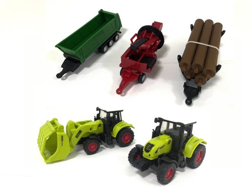 Set obsahuje traktor a valník k připojení a další doplňky.
