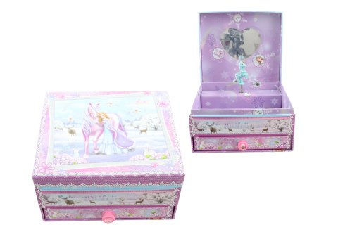 Hrací skříňka šperkovnice truhla. Uvnitř špekovnice je zrcátko a jednorožec, který po natažení klíčku tančí a hraje. Velikost cca 16 x 14 x 9 cm. Baleno v igelitovém sáčku. Šperkovnice má dole šuplíček. Výrobek není hračka.