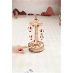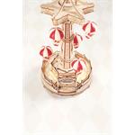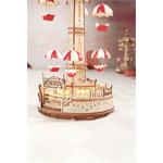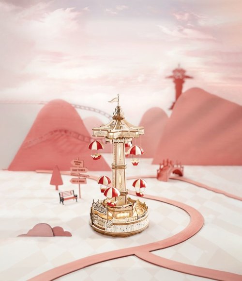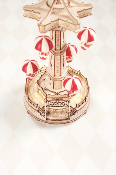 Designér se nechal inspirovat klasickou atrakcí padákové věže ve skutečném zábavním parku a upravil ji tak, že zvedání padáku probíhá stupňovitě nahoru a dolů. Šestiúhelníková základna kopíruje tvar stropu a boční okna jsou vyrobená z průsvitných materiálů, která mohou propouštět teplé světlo a poskytují plný pocit atmosféry. Celkem jsou zde tři světla. Kolotoč je poháněný bateriově napájeným (baterie nejsou součástí balení) motorkem a osvětlen pomocí LED. Dotykovým ovládáním můžete zvlášť kontrolovat jeho pohyb a zvuk. Dodáváno v nesloženém stavu, baleno v krabici.