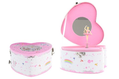 Hrací skříňka šperkovnice srdíčko. Uvnitř špekovnice je zrcátko a baletka, která po natažení klíčku tančí a hraje. Velikost cca 16,5 x 15 x 8 cm. Baleno v igelitovém sáčku. Výrobek není hračka.