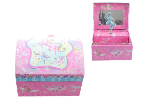 Hrací skříňka šperkovnice truhla. Uvnitř špekovnice je zrcátko a jednorožec, který po natažení klíčku tančí a hraje. Velikost cca 13 x 10 x 10 cm. Baleno v igelitovém sáčku. Výrobek není hračka.