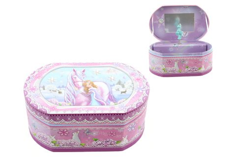 Hrací skříňka šperkovnice truhla. Uvnitř špekovnice je zrcátko a jednorožec, který po natažení klíčku tančí a hraje. Velikost cca 17 x 11 x 8 cm. Baleno v igelitovém sáčku. Výrobek není hračka.