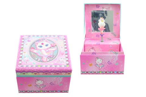 Hrací skříňka šperkovnice truhla. Uvnitř špekovnice je zrcátko a kočka, která po natažení klíčku tančí a hraje. Velikost cca 11 x 11 x 8 cm. Baleno v igelitovém sáčku. Výrobek není hračka.