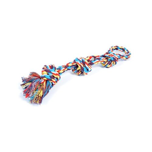 Bavlněné přetahovadlo pro psy je spletené z pevných barevných provázků s uzly. Na jedné straně je zakončené okem pro lepší úchop při hře. Hodí se pro přetahování, aportování i kousání. Bavlněné provázky během hry přirozeně čistí chrup a přispívají tak ke zdraví zubů a dásní. Délka (cca): 60 cm Materiál: bavlna Upozornění: Není určeno dětem. Hračku pravidelně kontrolujte a v případě poškození přestaňte používat.