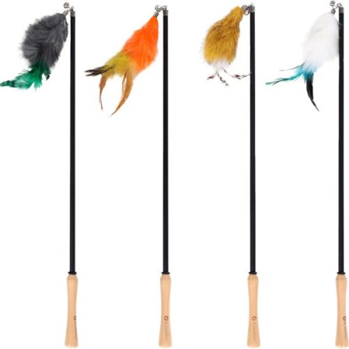 sklolaminátová hůlka s dřevěnou rukojetí s cinkající rolničkou, hustým plyšovo–peříčkovým ocáskem zahání nudu, stimuluje lovecký instinkt vyměnitelný/rozšiřitelný závěs nastavitelná délka hůlky