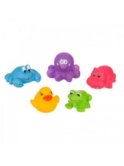 Barevné hračky do koupele Akuku. Sada 5 roztomilých barevných hraček - kachnička, žabka, hrošík, krab, chobotnice. Ideální na hraní ve vaně. Veselé barvy přitahnou pozornost našich nejmenších. Každá hračka má otvor, kterým můžete stříkat vodu. Zaoblené tvary zaručují bezpečnost během hry. Vyrobeny z bezpečných, vysoce kvalitních materiálů, neobsahují bisfenol A. Výška hraček 4 až 5 cm.