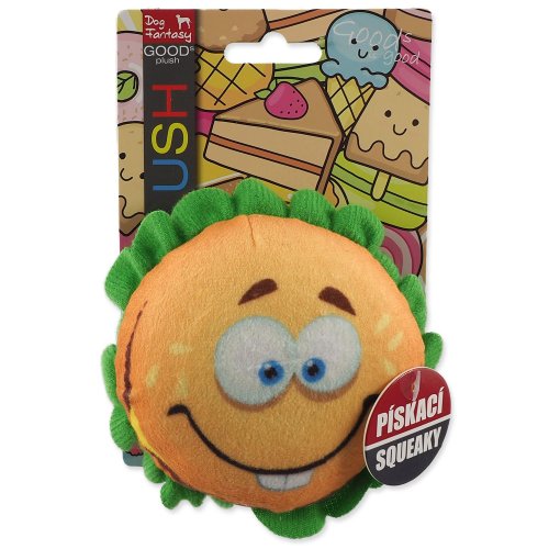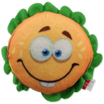 Roztomilá plyšová hračka ve tvaru hamburgeru. Při stlačení hračka píská.