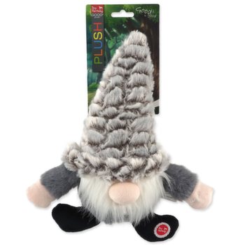 Plyšový skřítek v šedé barvě. Čepice šustí a při stlačení nad hlavou hračka píská.
