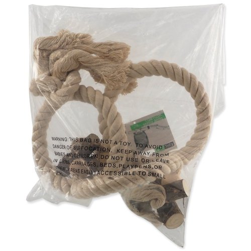 Závěsná hračka lanové kruhy se zvonečkem a dřívky vhodná pro střední a velké exotické ptactvo.