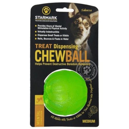 Míč Chew ball lze využít při interaktivní hře s krmivem nebo například jako odměna při aportování a přetahování. Lze ho naplnit různými pamlsky nebo granulemi, které se při jeho žvýkání postupně uvolňují z otvoru. Míč je vyroben z extrémně odolného, ale měkkého materiálu šetrného k zubům a dásním Vašeho pejska a neobsahuje latex, vinyl ani ftaláty. Perfektně letí vzduchem, dobře se odráží od země, pluje na vodě. Ideální pro střední plemena psů. Rozměry: M Průměr: 7 cm Barva: zelená