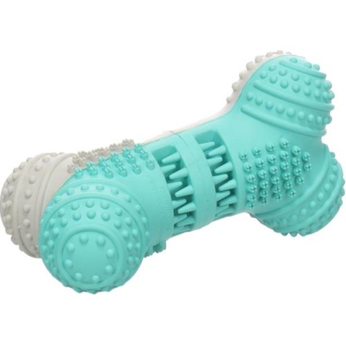 Gumová hračka pro psy ve tvaru činky při kousání masíruje dásně a pomáhá omezovat tvorbu zubního plaku, čímž přispívá k přirozené péči o chrup. Prohlubně v hračce lze naplnit drobnými pamlsky nebo jedlou pastou. Rozměry (cca): 12,8 × 7,3 × 7,1 cm Materiál: guma Barva: světle šedá, zelená Upozornění: Hračka není určena dětem. K použití pouze pod dohledem. Hračku pravidelně kontrolujte a v případě poškození přestaňte používat.