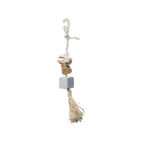 Hračka pro králíky a hlodavce je vyrobená z různých přírodních materiálů. Nabízí několik hlodacích prvků, které přinášejí pestrost a stimulaci. Vaše zvíře si s ní bude rádo hrát a okusovat ji. Podporuje přirozené hlodací chování a pomáhá naplnit potřebu obrušování zubů. Snadno ji zavěsíte do každé klece nebo jiné ubikace. Rozměry (cca): 32 × 6,5 × 6,5 cm Materiál: sisal, kukuřičný list, lufa, pemza, rafie