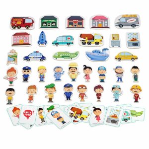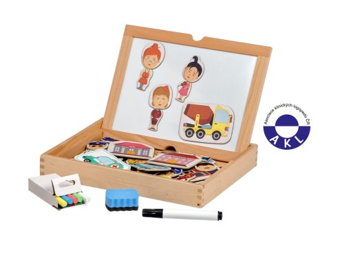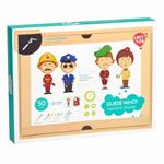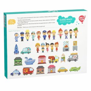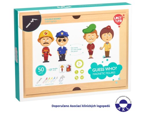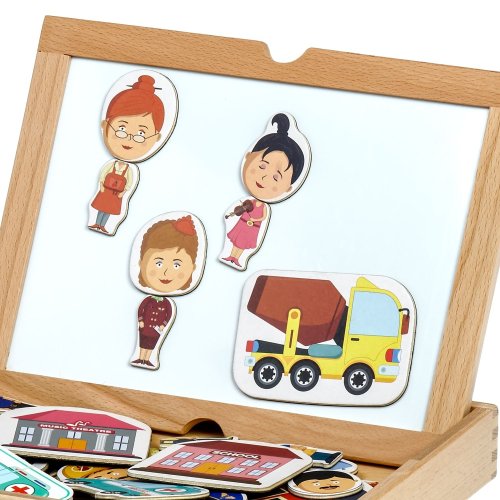 Děti vybírají správné kombinace magnetických částí a přiřazují je k předlohám, hádají povolání a vytvářejí vlastní příběhy. Díky kartám a oboustranné tabuli procvičí barvy, tvary i vyjadřování a naučí se spolupracovat. Po hře vše snadno uloží do dřvěného kufříku, který snadno sbalí s sebou na cesty.