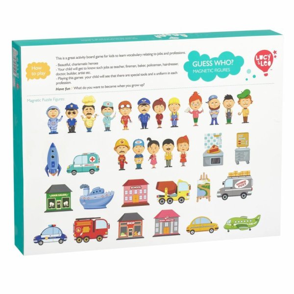 Lucy & Leo 178 „Uhádneš mé povolání?“ je magnetická hra v praktickém dřevěném kufříku, která děti zábavnou formou seznamuje s různými profesemi. V kufříku najdete 17 dvoudílných postaviček představujících rozmanitá povolání a oboustranné hrací víko pro kreslení i skládání.