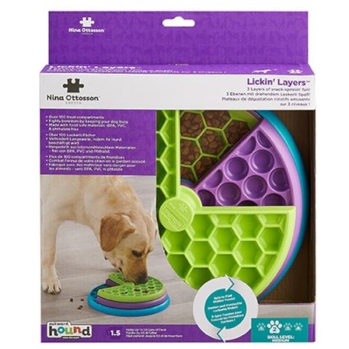 Hračka z dílny Niny Ottosson tříbí psí intelekt, zahání nudu a pomáhá omezit destruktivní chování. Slouží také jako zpomalovač krmení – zabraňuje nezdravému hltání. Má stabilní základnu a lze použít na suché i mokré krmivo. Je vhodná pro psy všech plemen, velikostí a věkových skupin. Nina Ottosson vyvíjí interaktivní hry a hračky pro domácí mazlíčky již od roku 1990 a od svých skromných počátků ve Švédku si postupně vydobyla celosvětové renomé. Dodnes zůstává věrná své filosofii, podle níž by hračky měly zaměstnávat a rozvíjet jak tělesnou, tak duševní zdatnost našich zvířecích společníků. Použití: Naplňte jednotlivé vrstvy rozložené hračky oblíbeným krmivem (suchým, vlhkým nebo jejich kombinací) vašeho psa. Plastový kolík zasuňte tak, aby vrstvy propojil. Ty pak libovolně pootočte a celou hračku nabídněte psovi. U hry psovi vždy asistujte a podporujte jej v hledání dobrot. Zároveň usměrňujte hru, aby nedošlo k poničení hračky. TIP: V teplém letním období můžete hračku naplnit arašídovým máslem nebo bílým jogurtem a nechat zamrazit. Hra bude pro psa nejen osvěžující, ale zároveň obtížnější a zabaví ho na delší dobu. Hlavní výhody: