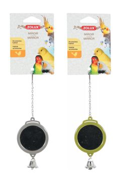 Plastové zrcátko se zvonečkem do klece pro ptáky v barvě zelené, šedé a bílé.