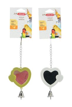 Plastové zrcátko se zvonečkem do klece pro ptáky v barvě zelené, šedé a bílé.