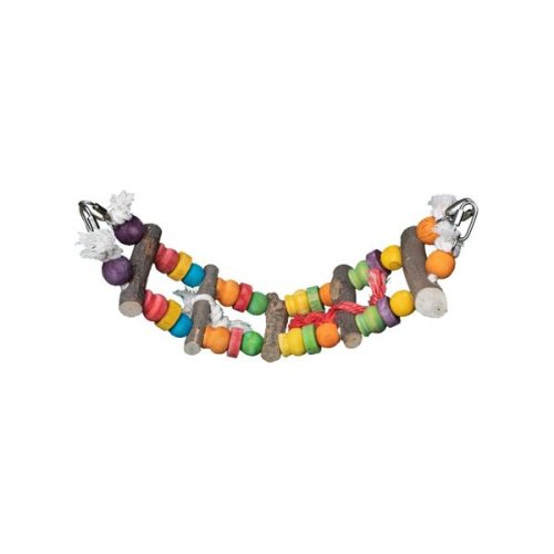 Veselá hračka v podobě mostu přináší zábavu a pohyb malým i středně velkým papouškům. Kombinace bavlněných lanek a dřevěných částí láká ke šplhání, ozobávání i prozkoumávání. Hračka je vybavena bezpečnými kovovými úchyty a byla testována z hlediska bezpečnosti i atraktivity pro papoušky. Je vyrobena z borovicového dřeva a bavlny, barvená přírodními barvivy. Všechny použité materiály jsou netoxické a bezpečné pro papoušky. Rozměry (cca): 11 × 44 cm Materiál: borovicové dřevo, bavlna, kov
