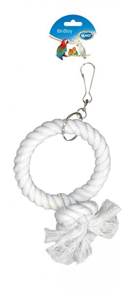 Kovový kruh omotaný bavlněným lanem slouží papouškům ke hře i odpočinku. Hračka je vhodná pro středně velké papoušky. Snadné připevnění ke kleci nebo do voliéry pomocí kovové karabinky nebo očka. Rozměry: vnitřní průměr kruhu 27 cm, vnější průměr kruhu 30 cm, průměr lana 1,5 cm