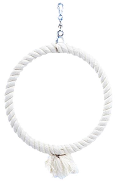 Závěsná hračka - bavlněný kruh pro střední papoušky. Kruh drží tvar díky pevně spletenému lanu. Snadné připevnění ke kleci pomocí karabinky nebo kovového očka. Průměr kruhu 24 cm. Hračka není určena ke konzumaci.