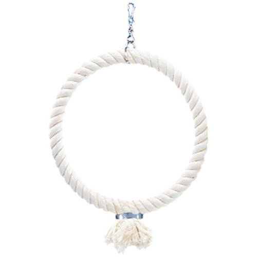 Závěsná hračka - bavlněný kruh pro střední a velké papoušky. Kruh drží tvar díky pevně spletenému lanu. Snadné připevnění ke kleci pomocí karabinky nebo kovového očka. Průměr kruhu 29 cm. Hračka není určena ke konzumaci.