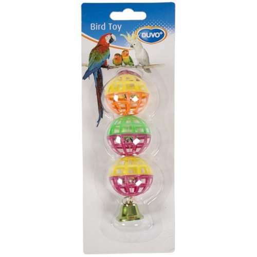 Ptáci mají rádi barevné hračky. Tyto tři plastové míčky se zvonkem obohatí prostředí v kleci a podnítí ptáky k aktivitě. Rozměry: délka 15cm, průměr míčků 4cm