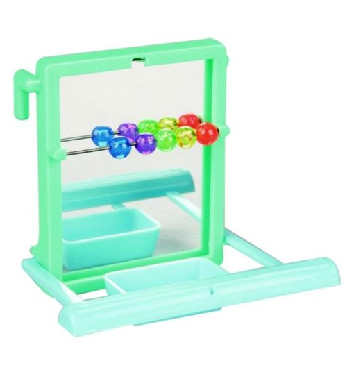 Závěsná plastová hračka pro papoušky – zrcátko s bidýlkem. Hračka je vhodná pro menší typy papoušků, např. andulky, kanárky, atd. Snadné zavěšení do klece či voliéry. Rozměry: 10 x 7 x 9 cm