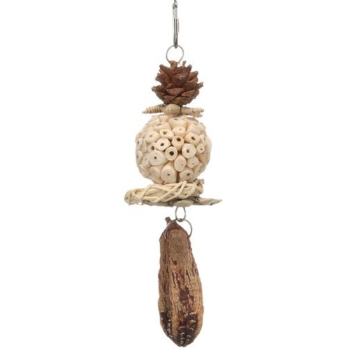 Přírodní závěsná hračka ze dřeva sola, palmových listů, mahagonového lusku, ratanu a borové šišky je vhodná pro různé druhy papoušků. Podporuje mentální aktivitu a přirozenou péči o zobák. Díky kovovému závěsnému systému ji lze snadno zavěsit do klece nebo voliéry. Součástí hračky jsou míček, šiška, mahagonový lusk, kroužek a hvězdičky, které vybízejí k ozobávání. Použité materiály jsou přírodní a bezpečné pro papoušky. Rozměry (cca): 6 × 6 × 29 cm Materiál: dřevo sola, palmové listy, mahagonový lusk, ratan, šiška a kov