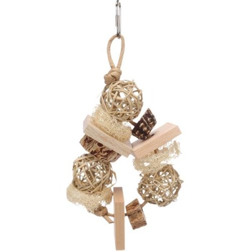 Přírodní závěsná hračka z lufy, borového dřeva, mahagonového lusku a ratanu je vhodná pro různé druhy papoušků. Podporuje mentální aktivitu a přirozenou péči o zobák. Díky kovovému závěsnému systému ji lze snadno zavěsit do klece nebo voliéry. Součástí hračky jsou míčky, lufa, mahagonový lusk a provázek, které vybízejí k ozobávání. Použité materiály jsou přírodní a bezpečné pro papoušky. Rozměry (cca): 11 × 4,5 × 25 cm Materiál: lufa, borové dřevo, mahagonový lusk, ratan a kov
