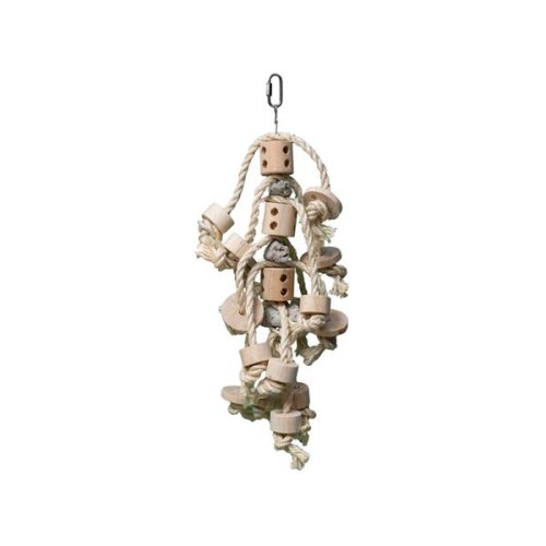 Závěsná hračka z borovicového dřeva, lávového kamene a sisalového provazu je vhodná pro malé až středně velké papoušky. Podporuje šplhání, ozobávání a zkoumání. Nabízí rozmanité podněty a představuje výzvu pro aktivní ptáky. Díky kovové karabince ji lze snadno zavěsit do klece nebo voliéry. Vyrobena z přírodních a bezpečných materiálů. Rozměry (cca): 49 × 30 cm Materiál: borovicové dřevo, sisal, lávový kámen, kov
