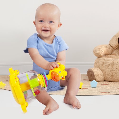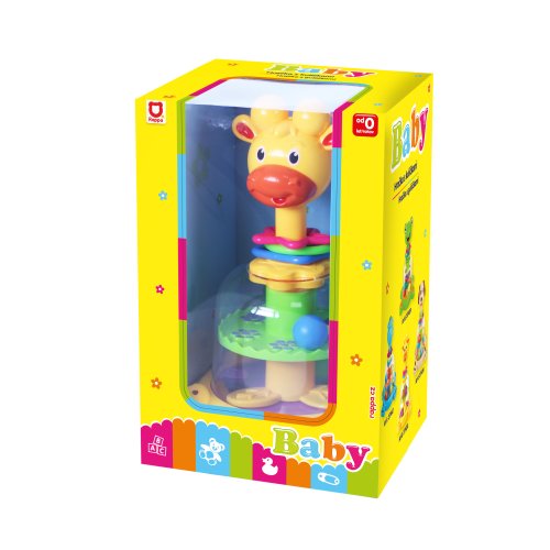 Pestrobarevný mechanický kolotoč ve tvaru žirafy je naplněný barevnými kuličkami, které budou po zmáčknutí hlavy rotovat, skákat a vydávat chrastící zvuk.Tato hračka zaujme a pobaví i ty nejmenší děti.