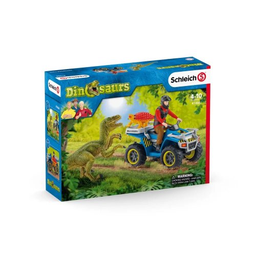 Pořiďte svým dětem detailně zpracovanou sadu figurek Útěk před Velociraptorem na čtyřkolce od značky Schleich. Velociraptor útočí na malého ankylosaura Kyla. Dokáže ho statečný dobrodruh Flynn Colby na své čtyřkolce zachránit? Flynn má pohyblivé ruce a na hlavě odnímatelnou helmu. Sada je vhodná pro děti od 4 let.