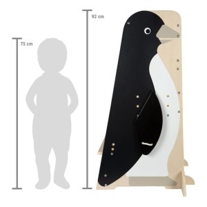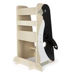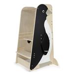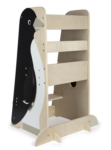 Učící věž 3 v 1 značky Small Foot funguje jako praktická víceúčelová stolička. Učící věže umožňují nejmenším dětem být v úrovni pracovní desky, vidět vše, co děláte, a pracovat s vámi. Pokud chcete, aby vaše dítě bylo součástí běžných činností u kuchyňské linky, v koupelně nebo u pracovního stolu, učící a pozorovací věž v designu tučňáka se jistě stane vašim každodenním pomocníkem. Je robustní a stabilní a díky ní se děti mohou zapojit do veškerého dění v domácnosti ve stejné výšce jako dospělí. Má výškově nastavitelnou plošinu a schůdek, poroste tedy s dítětem, a zábrana zajistí jeho bezpečnost. Skládací křídla tučňáka poskytují úložný prostor pro utěrky, chňapky a další drobnosti. Při používání nenechávejte učící věž v prostoru, ale vždy věž umístěte stranou naproti schůdku k pevné překážce (kuchyňská linka apod.).