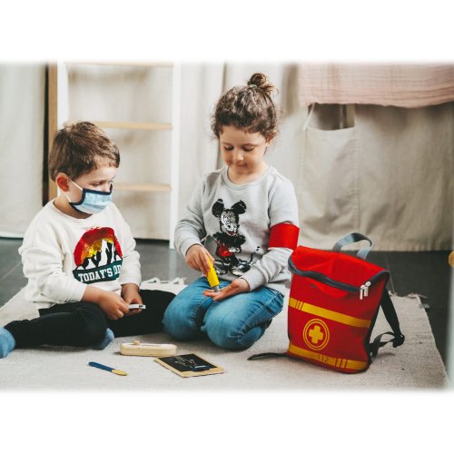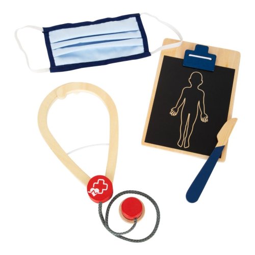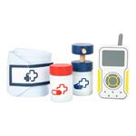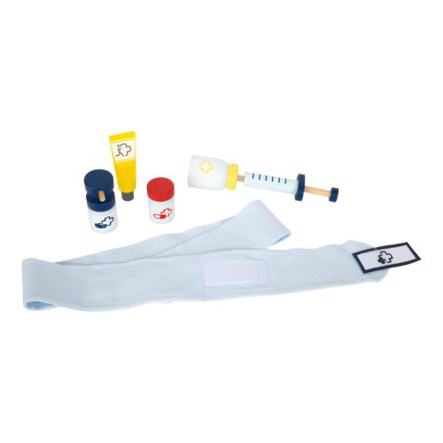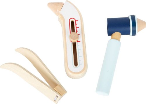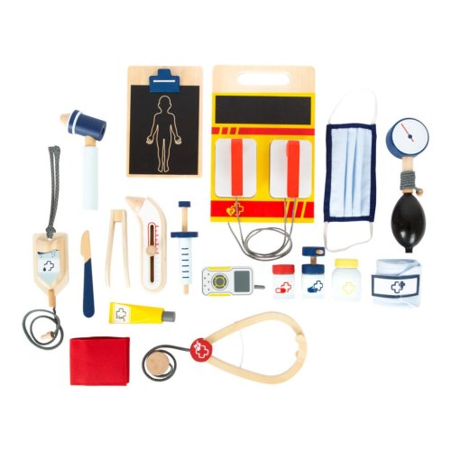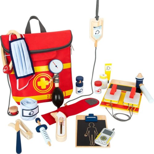 Se záchranářským batohem Small Foot zachrání vaše dítě svého oblíbeného plyšáka před všemi imaginárními nemocemi. V batůžku najde všechny možné lékařské pomůcky z pevného dřeva a stane se malým záchranářem hraček. Svým pacientům změří tlak, vyšetří jim uši, změří teplotu nebo je připraví na operaci. Váš potomek si vyhraje s tlakoměrem, infúzí, otoskopem s opravdovou lupou, teploměrem, defibrilátorem, injekční stříkačkou, náplastmi na suchý zip, stetoskopem, skalpelem a dalším příslušenstvím, které nalezne v balení. Na každém nástroji je drobná ilustrace pro lehčí rozpoznání pomůcek.