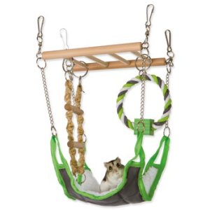 Závěsný žebřík s pelíškem a bavlněným kruhem sloužící jako místo pro odpočinek malých hlodavců.