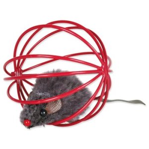 Hračka pro kočky myš v kovové kleci.
