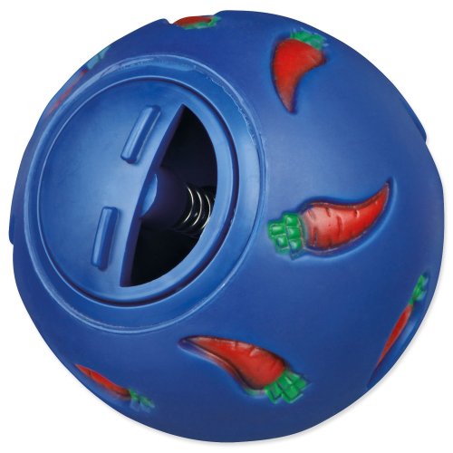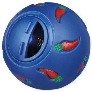 Barevný plastový míč s nastavitelným otvorem na pamlsky.
