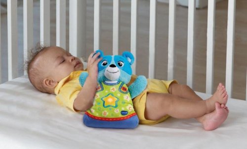 VTech Usínáček Medvídek pomůže děťátku relaxovat i usnout. Tento jemný a roztomilý medvídek hraje uklidňující melodie od nejuznávanějších světových "klasiků" jako jsou Debussy, Beethoven, Čajkovsky, Brahms, Mozart, Liszt, Bach a mnoho dalších. Kratičké ukolébavky pro ty nejmenší nazpívala Petra Černocká. Medvídek také mluví. Chce například obejmout, dává pusinku a děťátku poví, že ho má rád. Příjemnou „spací atmosféru" navodí i zvuky ptáků, tekoucí vody nebo mořských vln. Hvězdička na bříšku je jemná na dotyk, funguje jako vypínač a navíc se pomaloučku střídavě rozsvěcí a zhasíná. Medvídkovo měkké zářící bříško nikde netlačí a je příjemné na dotyk. Po odpojení a vyjmutí krabičky s elektronikou (jde to velice snadno) lze Usínáčka i vyprat. VTech Usínáček Medvídek je určen pro děti od narození. Funguje na 3 AA baterie, které jsou součástí balení. SEZNAM MELODIÍ: Beautiful Dreamer, Clair de Lune (Debussy), All Through The Night, Au Claire de la Lune, Moonlight Sonata (Beethoven), Sleeping Beauty Waltz (Tchaikovsky), To a Wild Rose (McDowell), Canon in D (Pachelbel), Lavender's Blue, Irish Lullaby, Spring Song, . Fur Elise, Go Tell Aunt Rody, Cradle Song (Brahms), The Riddle Song, Oh Dear! What, Can the Matter Be?, Sweet and Low, Moonlight Bay, Dream of Love (Liszt), Minuet in G (Bach), Where Has My Little Dog Gone?, Morning - Peer Gynt Suite (Grieg), Farmer in the Dell, Shenandoah, Rock-a-bye Baby, Greensleeves, Are You Sleeping?, Row, Row, Row Your Boat, Jesu, Joy of Man's Desiring (Bach), Twinkle, Twinkle Little Star, Winter - The Four Seasons (Vivaldi), Minuet (Mozart)