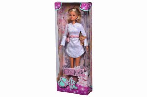 Panenka Steffi v módních šatech, s náušnicemi, páskem, kabelkou a psem.