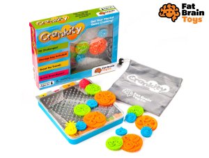 Hlavolam Crankity. Balení obsahuje 14 ozubených koleček, kliku, vkládací plochu a 40 karet s hlavolamy.