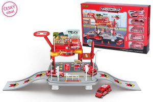 Hasičská stanice s auty. Rozměry 65x19x24,5 cm.