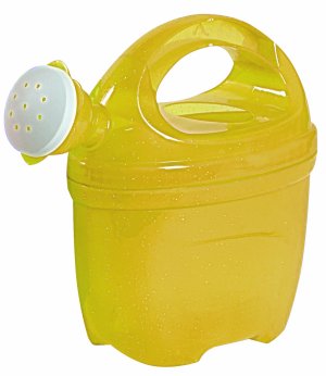 Průhledná konvička na vodu se třpytkami a s kropítkem ve tvaru kytičky.