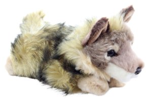 Plyšový kojot ležící o rozměrech 25x7x11 cm.