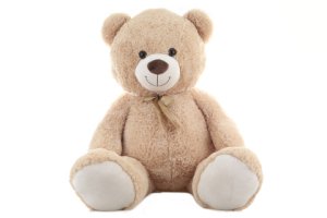 Plyšový medvěd s mašlí. Rozměry 130x80x38 cm.
