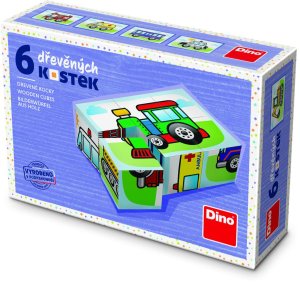 Kvalitní dřevěné kostky, ze kterých složíte 6 obrázků s jednoduchými dětskými motivy dopravních prostředků.