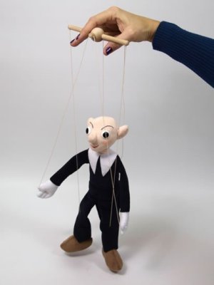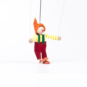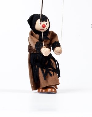 Textilní loutka s dřevěným vodícím křížem.
