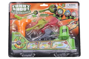 Vystřelovací hra s terčem. Obsahuje prak, 3 šípy, 3 terče. 2 varianty - terč kelímky, terč karty s podstavci.