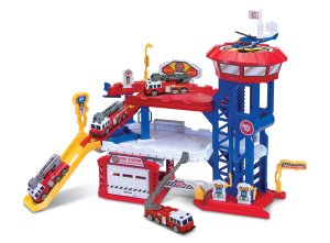 Volvo Edice dárková sada 4 kovových aut a stavebních mechanismů na volnoběh (pásové rýpadlo, kolový nakladač, dampr, tahač s korbou), s otevíracími částmi.