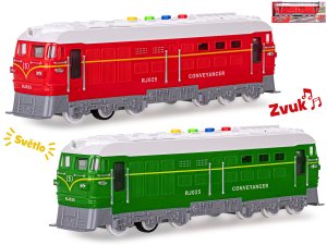 Vlak na setrvačník s efekty. Rozměry 34x6,5x10 cm.